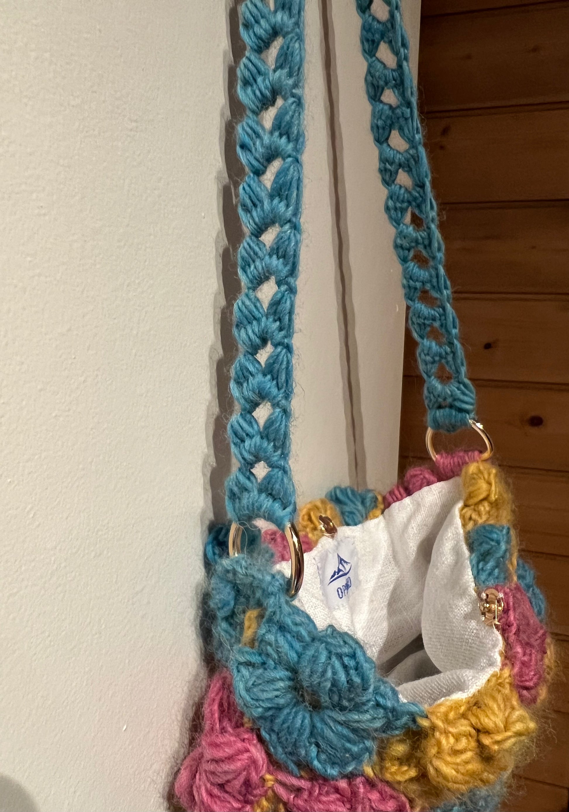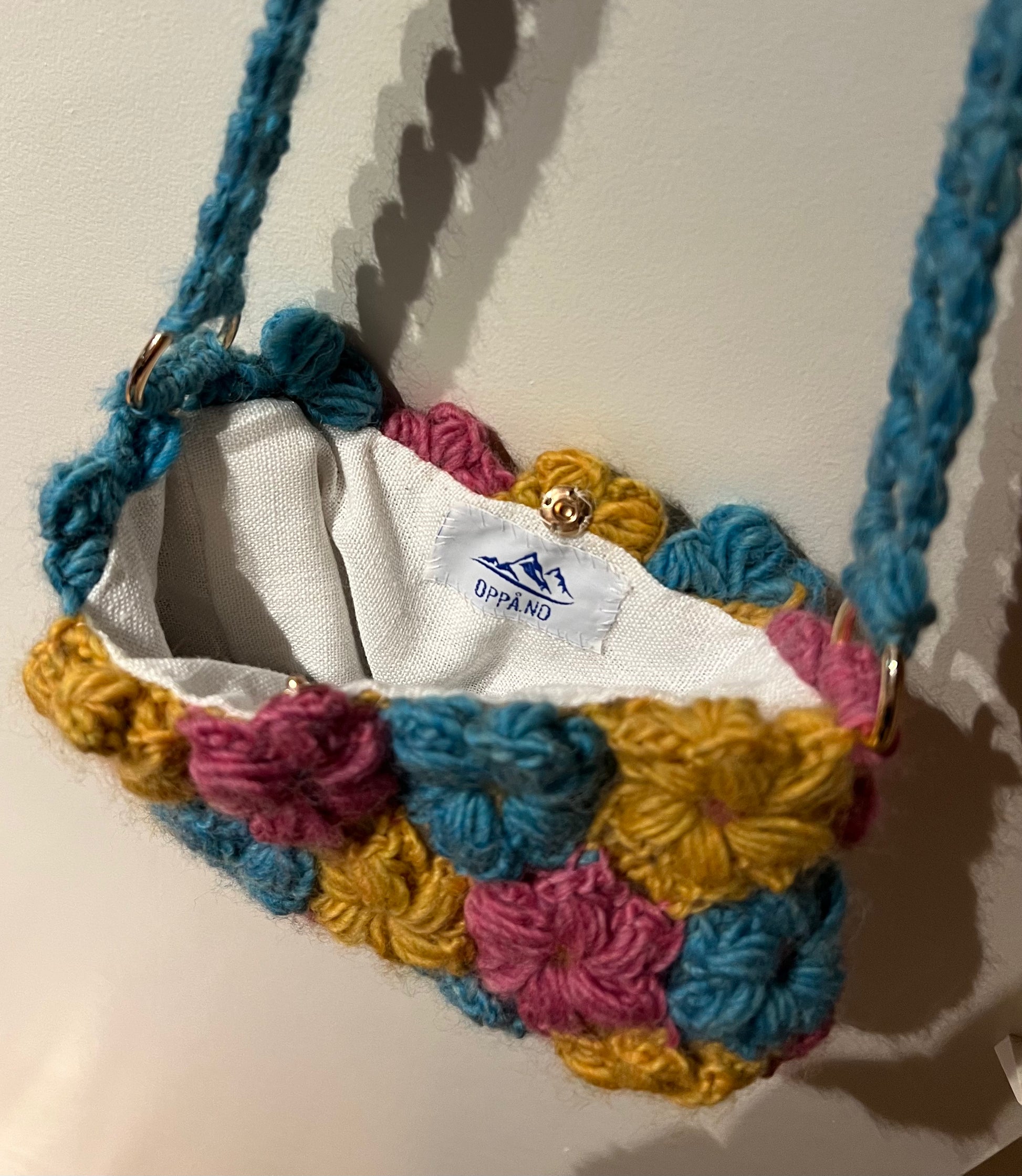 En skulderveske heklet av mange supersøte små blomster. Vesken har en trykk-knapp midt på så den kan lukkes.