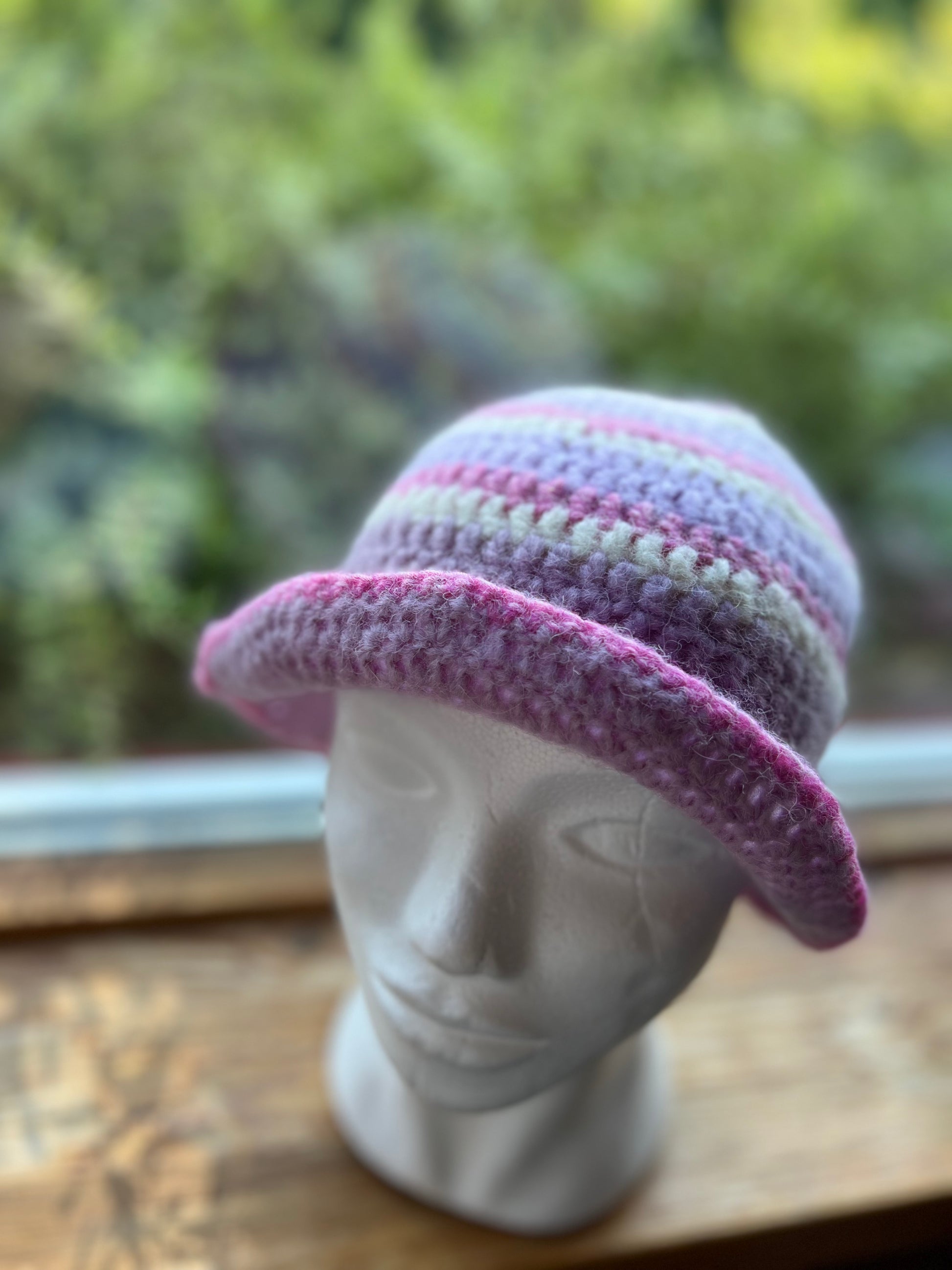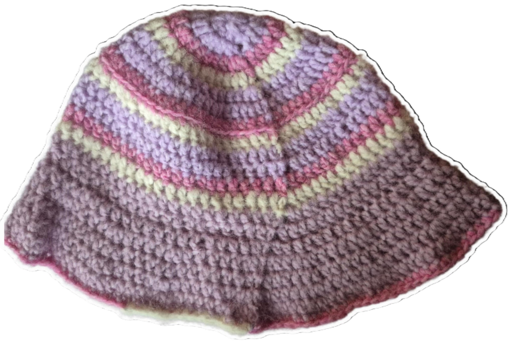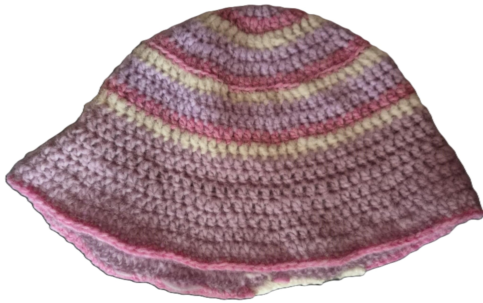 Unik bøttehatt som er heklet i restegarn. Holder hodet varmt på kjølige dager og bremmen gir øynene beskyttelse mot solen.