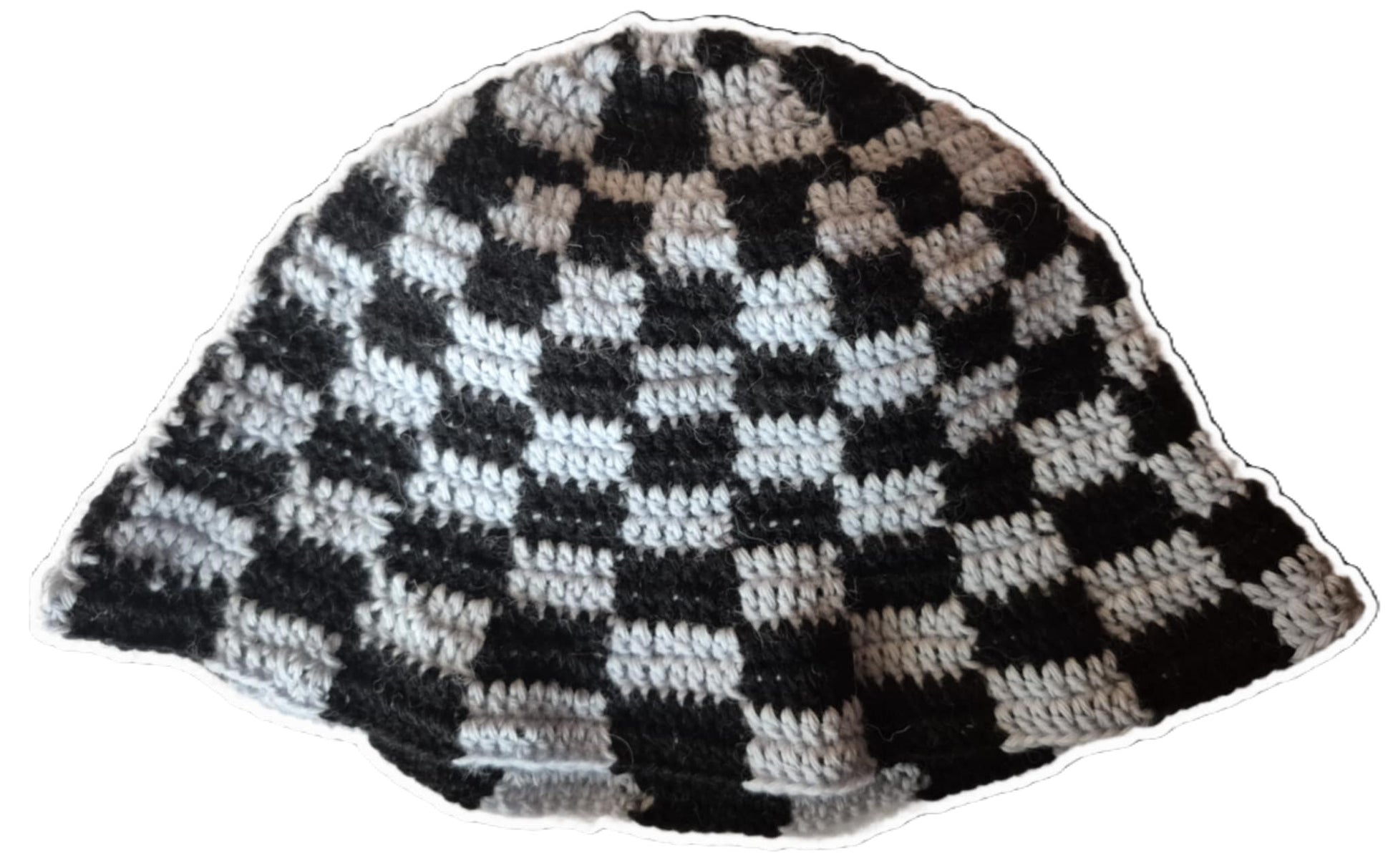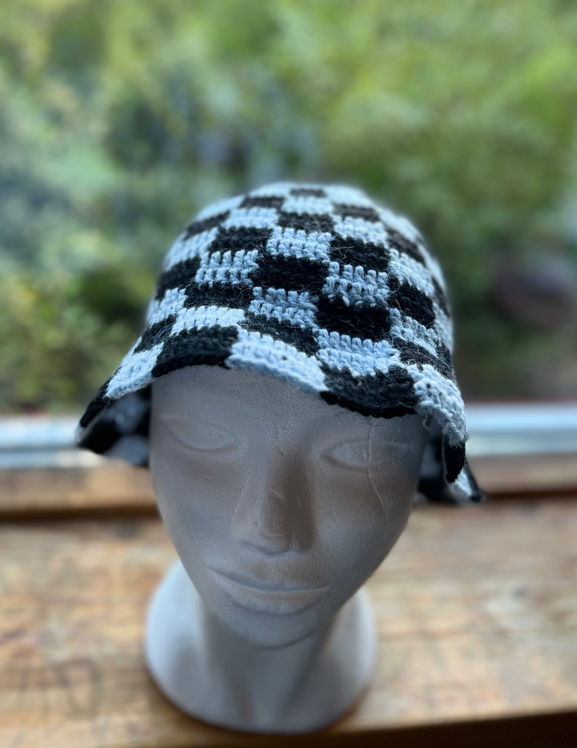 Unik bøttehatt som er heklet i restegarn. Holder hodet varmt på kjølige dager og bremen gir øynene beskyttelse mot solen.