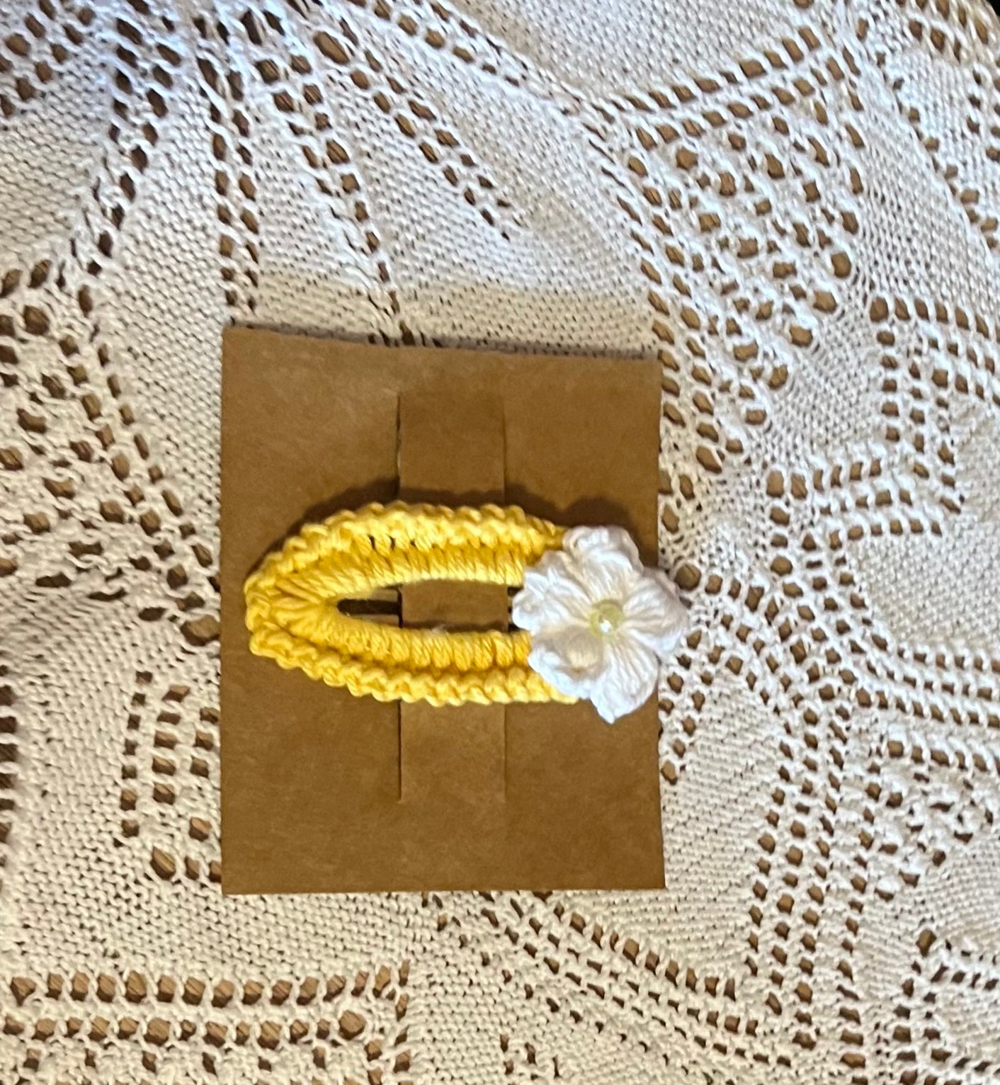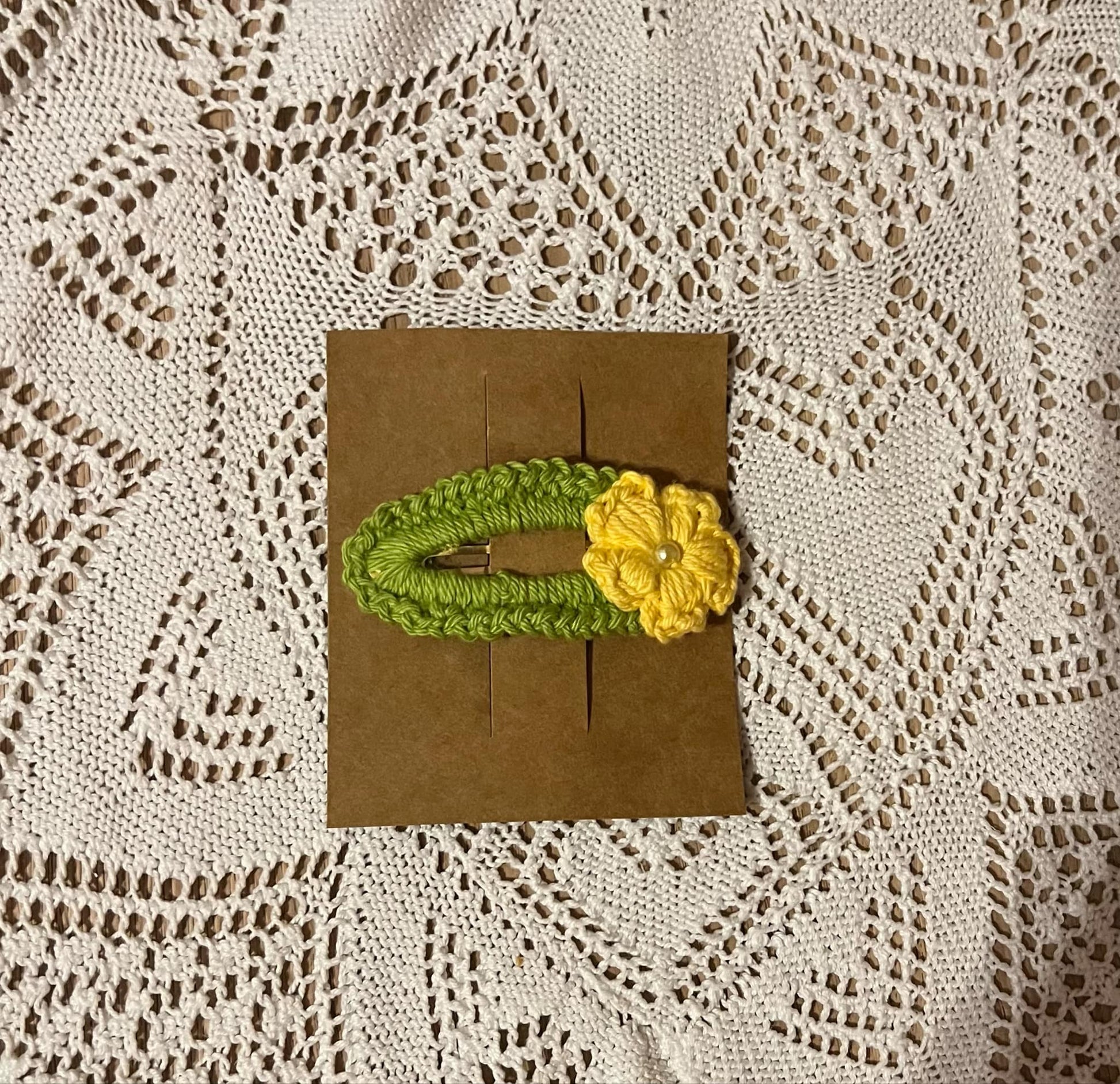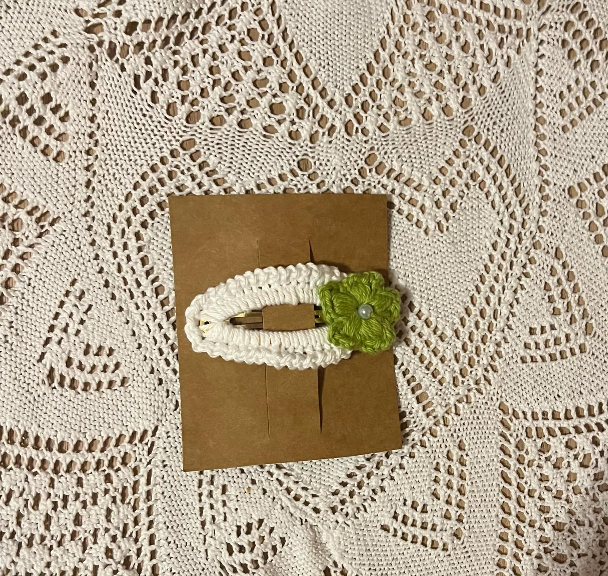 Unik og supersøt hårspenne i heklet design. Garnet er 100% bomullsgarn.