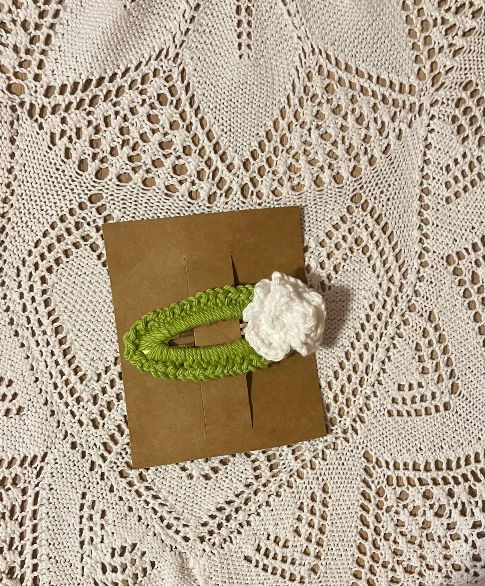 Unik og supersøt hårspenne i heklet design. Garnet er 100% bomullsgarn.