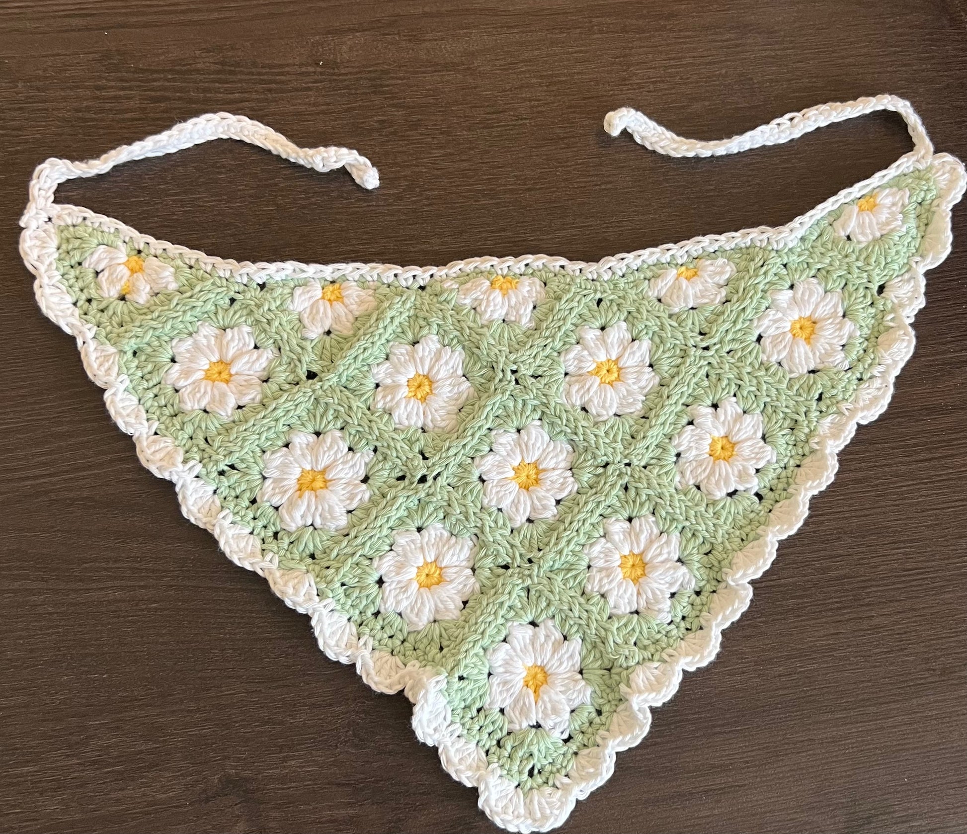 Et håndheklet skaut inspirert av de første vårblomstene i skogkanten. Laget med myk bomull i lysegrønt og hvitt, med små blomster som minner om hvitveis.
