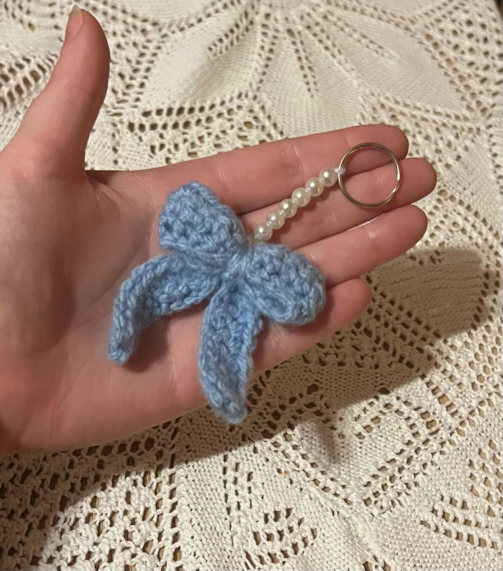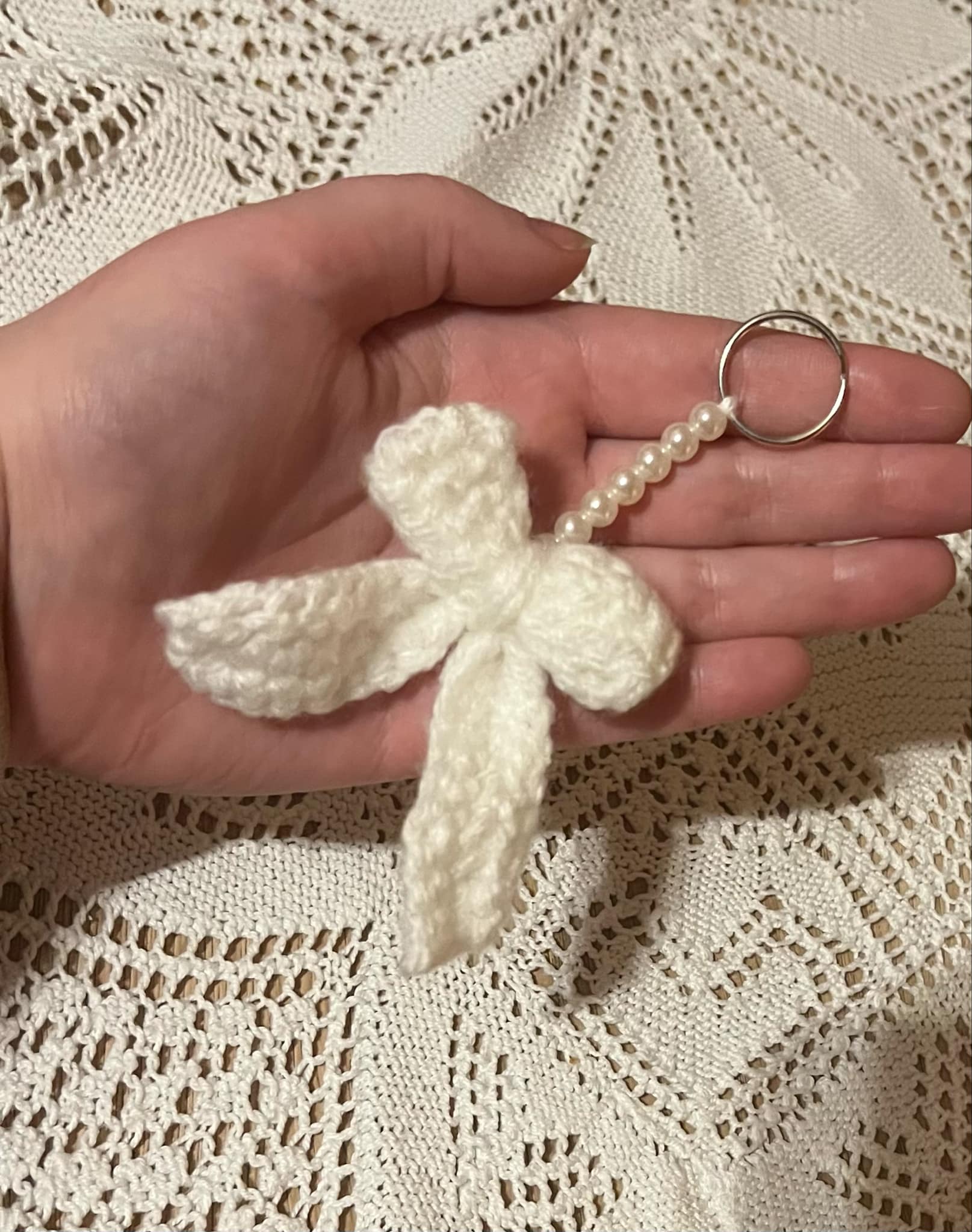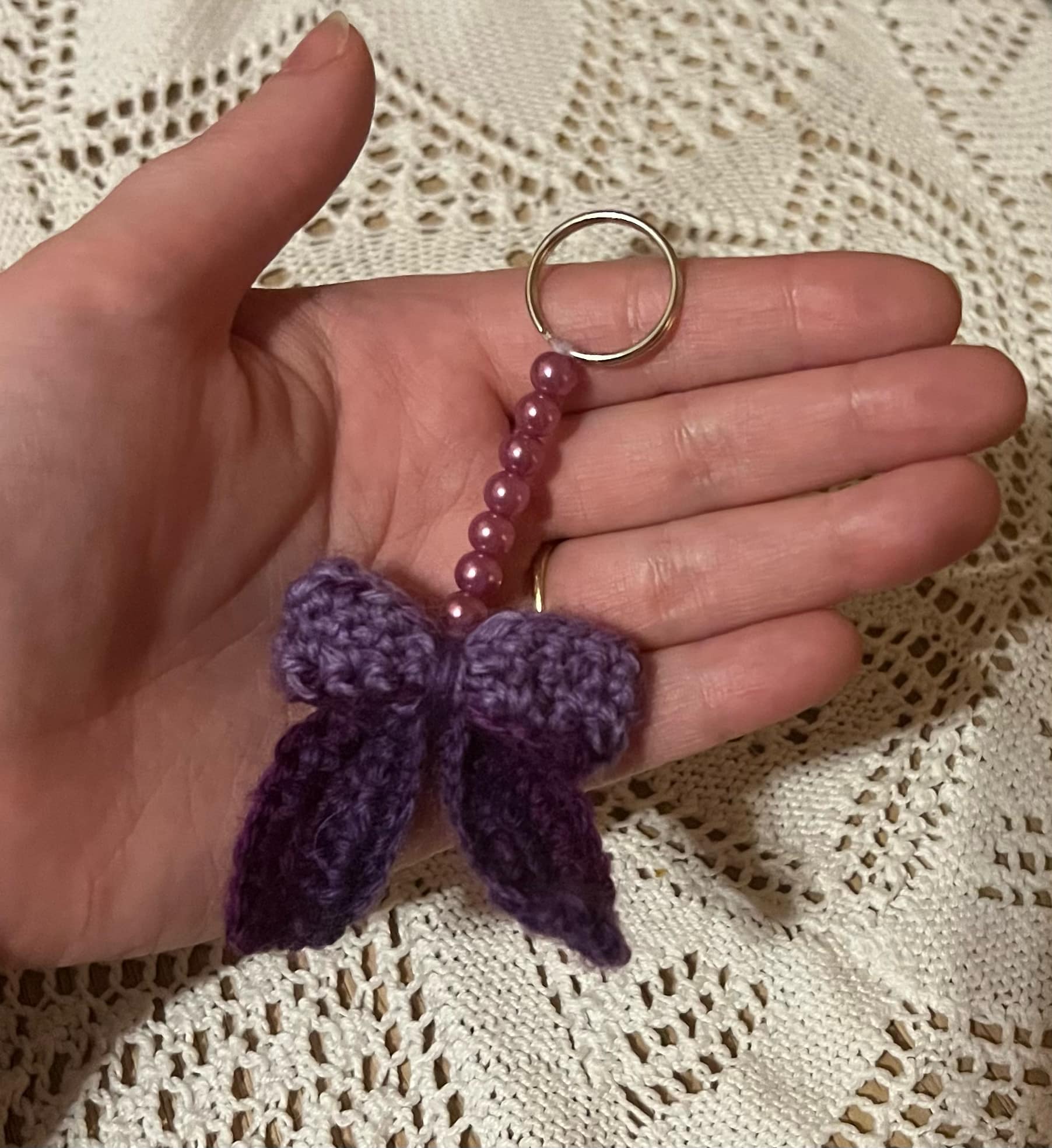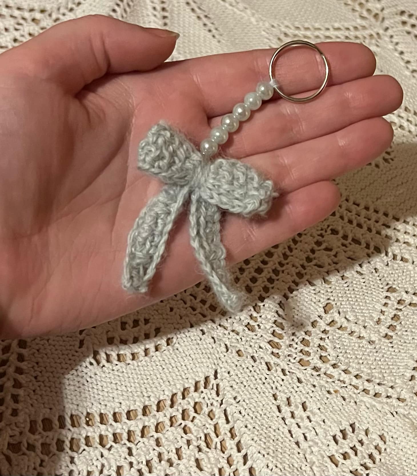 En liten sløyfe med stor personlighet – alltid med på nøkkelknippet. Heklet sløyfe med perlesnor.